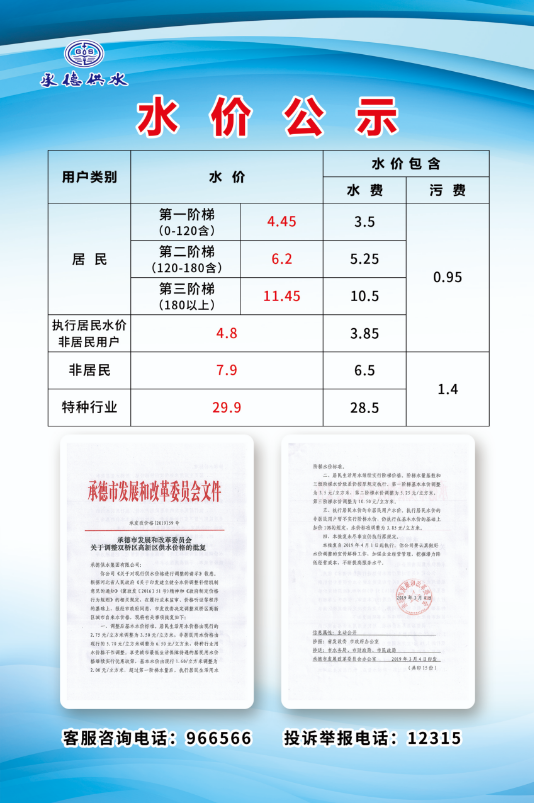 24小時供水服務(wù)熱線0314-966566 監(jiān)督電話0314-966566 電子郵箱cdszlsgs@126.com