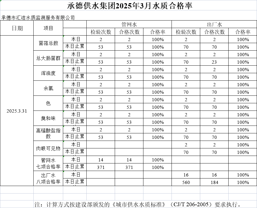承德供水集團2025年3月31日水質(zhì)合格率
